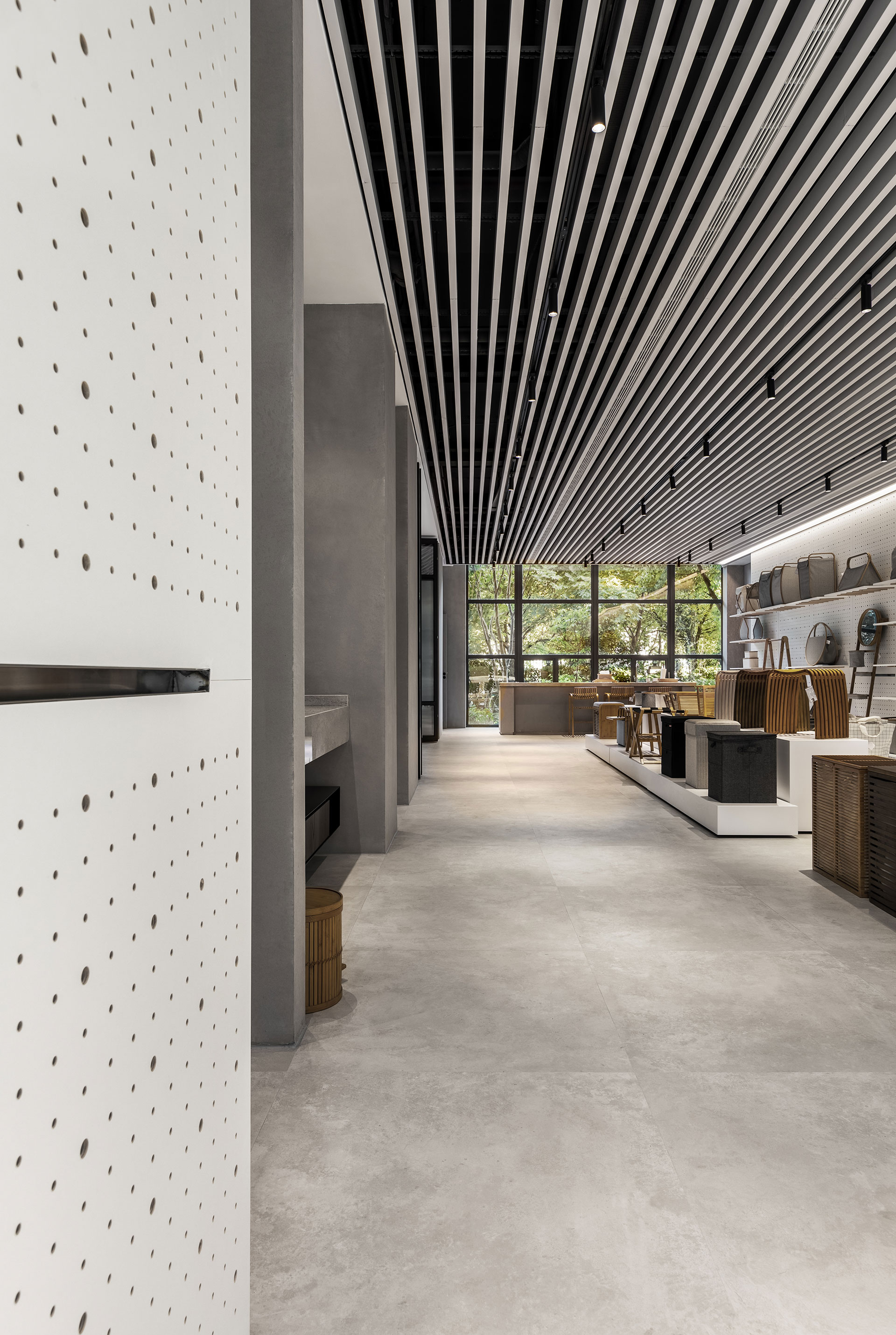 收合折疊門片所形塑的弱分界,原先霧面玻璃吸收的自然光線瞬間湧流,隨著石英磚逐步抬升,樓梯轉折延續牆腳的光帶裝置,將腳步輕盈地帶向展示區域。設計師考量品牌著重以布、竹媒材為主的家飾產品,因此場域色澤保持質樸簡約。