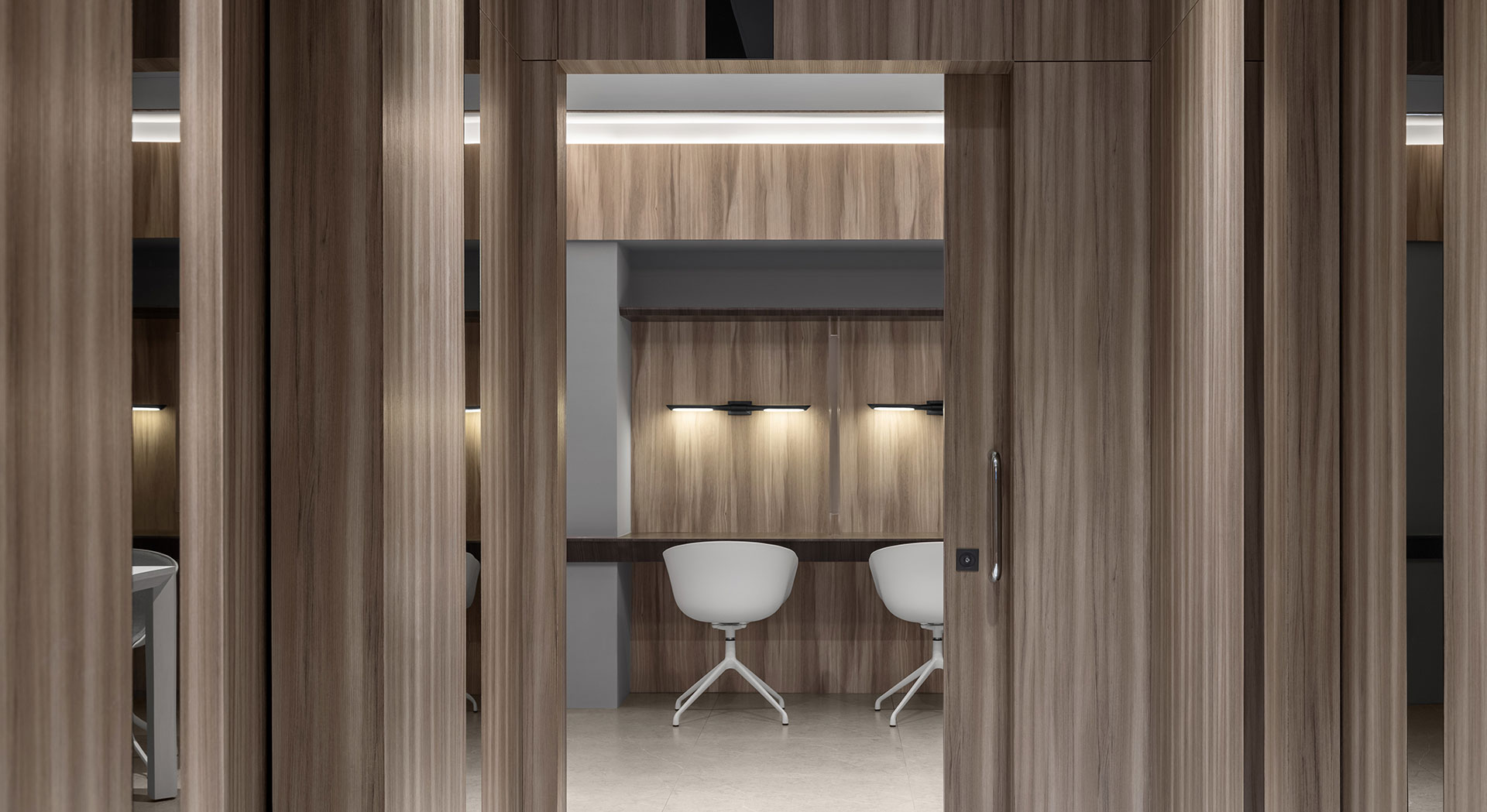 右側通道後方規劃了K書/家教中心,以灰色的空間搭配溫潤的木皮,讓住戶可以在靜謐的空間裡,盡情沉浸在知識的殿堂之中;也可以聘請家教在這裡進行教學,省卻了在家中的不便利性。