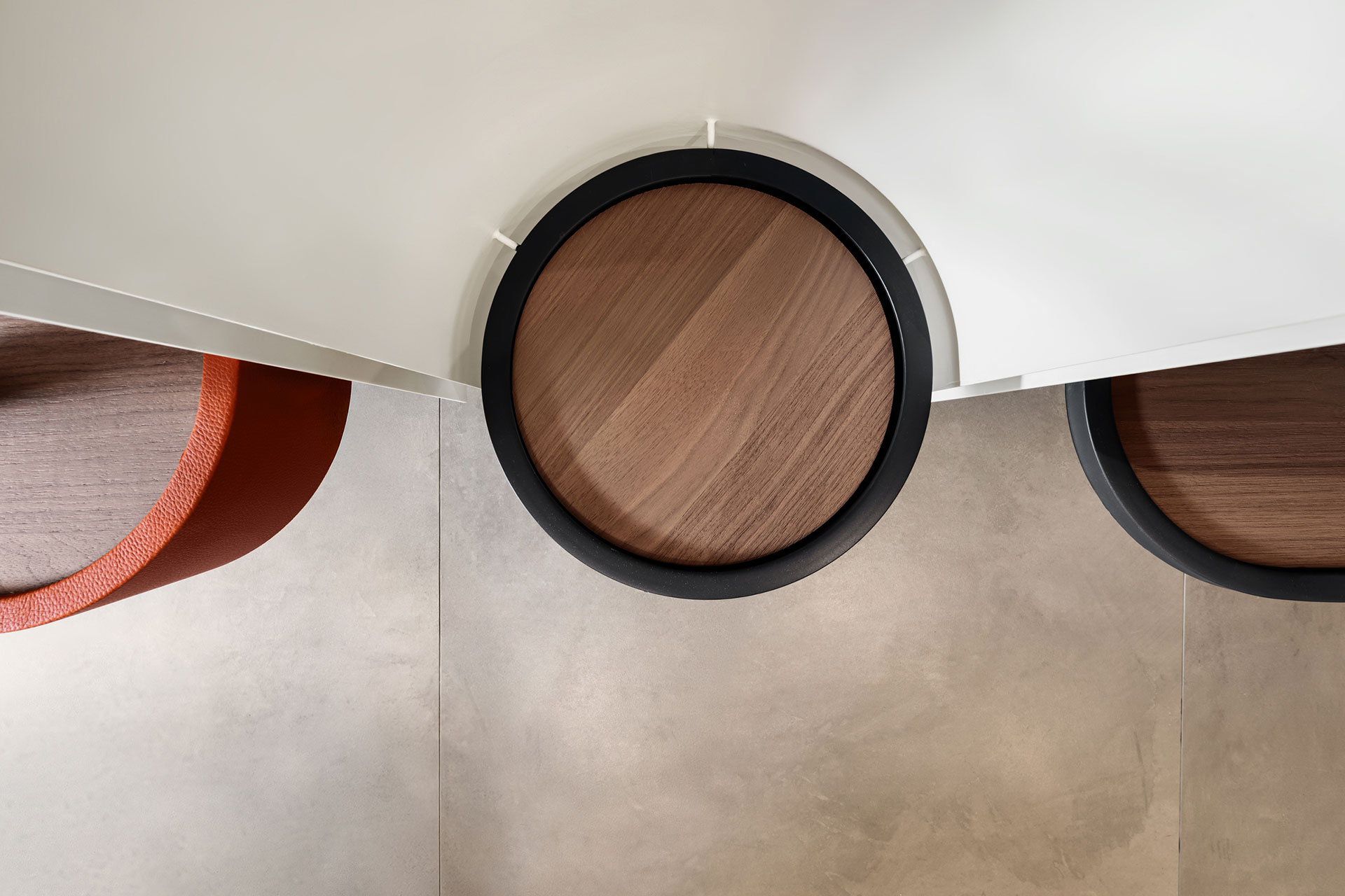 延續未來建築豎向半圓之特殊開窗形式,整個接待中心與樣品屋皆採曲面式造型設計,除了柔化室內空間之視覺體驗外,搭配細緻之細節設計,我們更想呈現出文藝復興年代,人們對美學與儀式感之空間價值觀與生活態度,讓人再次憶起數十年前孩童巷弄嬉戲奔跑之都市悠活空間情境。