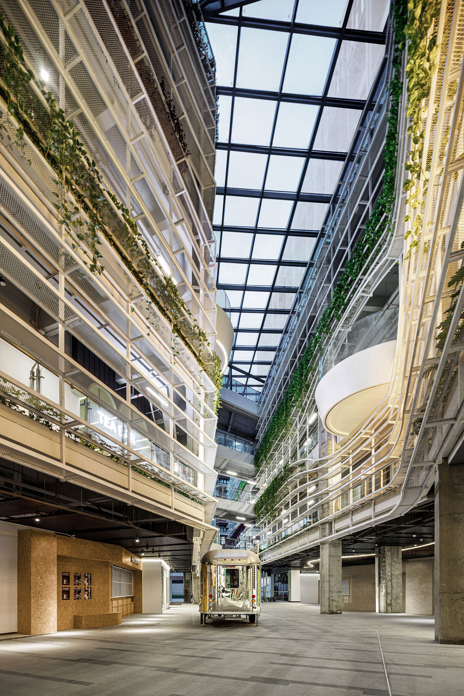 整個建築的裙樓樓層,透過中央生態綠軸線的挑空置入,各式商業與辦公活動交織成一種生活場景的共用社區表情,如同人們在山谷裡匯聚一般,同時也為社區注入了最重要的永續生態環境。