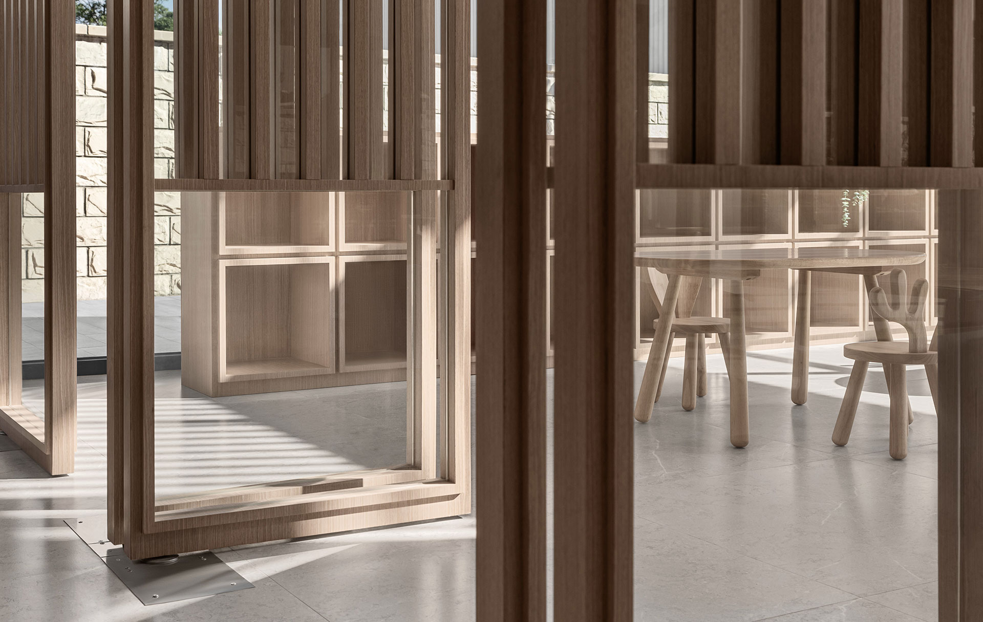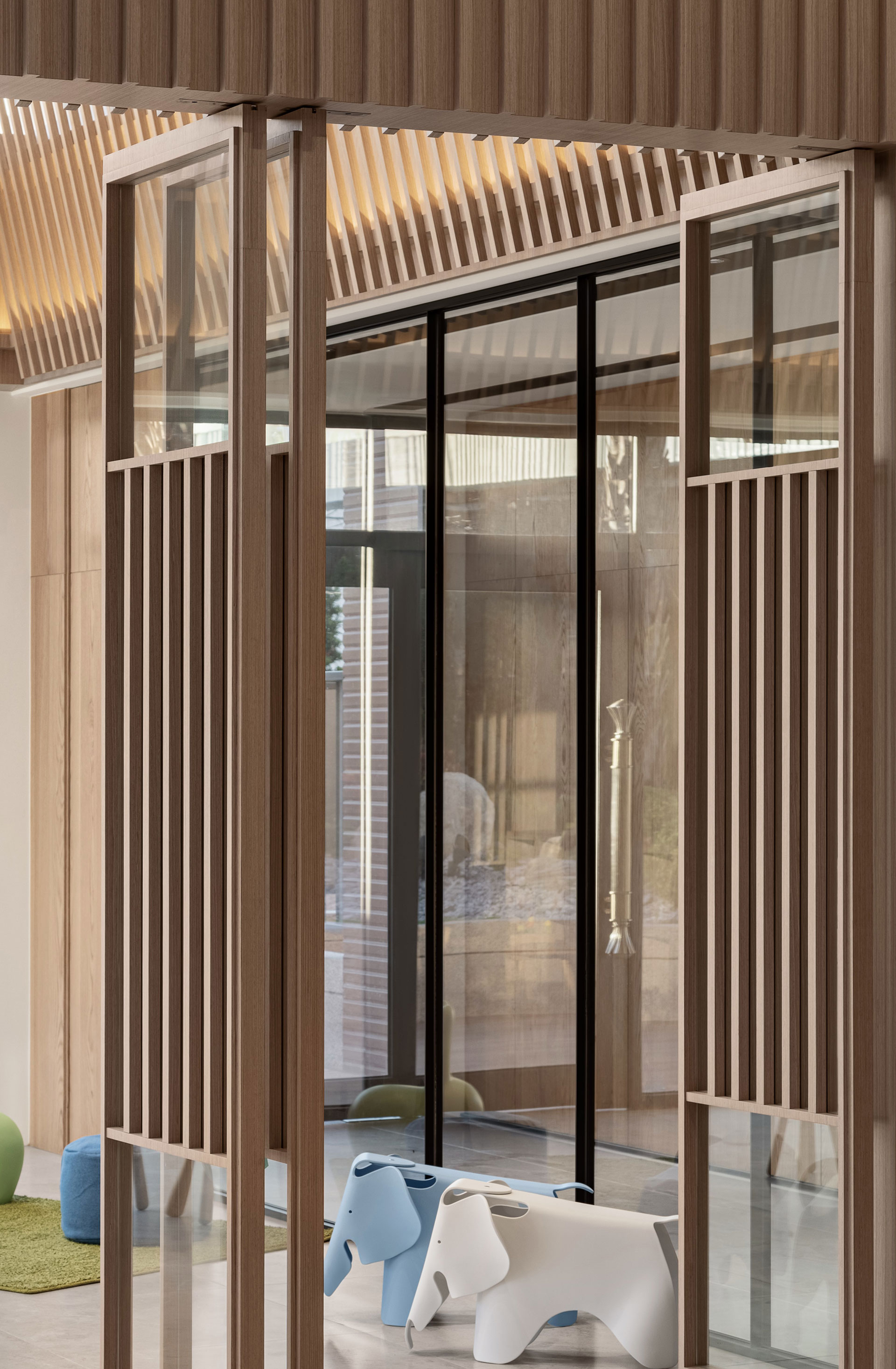 左側通道連結著媽媽教室與兒童遊戲室,兩個空間以格柵門做區隔,讓家長可以安心地看著兒女們與鄰家小孩嬉戲,同時可以享有自己的空間;更可以在媽媽教室裡與鄰居一同進行廚藝、花藝…等手做的研習,讓住戶間的交流更為緊密;平時也可以在這裡進行閱讀、會議…等。6片格柵門可以全開的與兒童遊戲室整合成一個寬敞的空間,讓社區舉辦活動時候自由的使用,享受著落地窗外的光線,與露臺景觀的視覺延伸。
