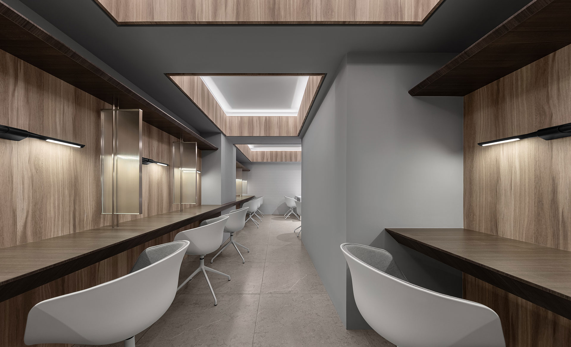 右側通道後方規劃了K書/家教中心,以灰色的空間搭配溫潤的木皮,讓住戶可以在靜謐的空間裡,盡情沉浸在知識的殿堂之中;也可以聘請家教在這裡進行教學,省卻了在家中的不便利性。