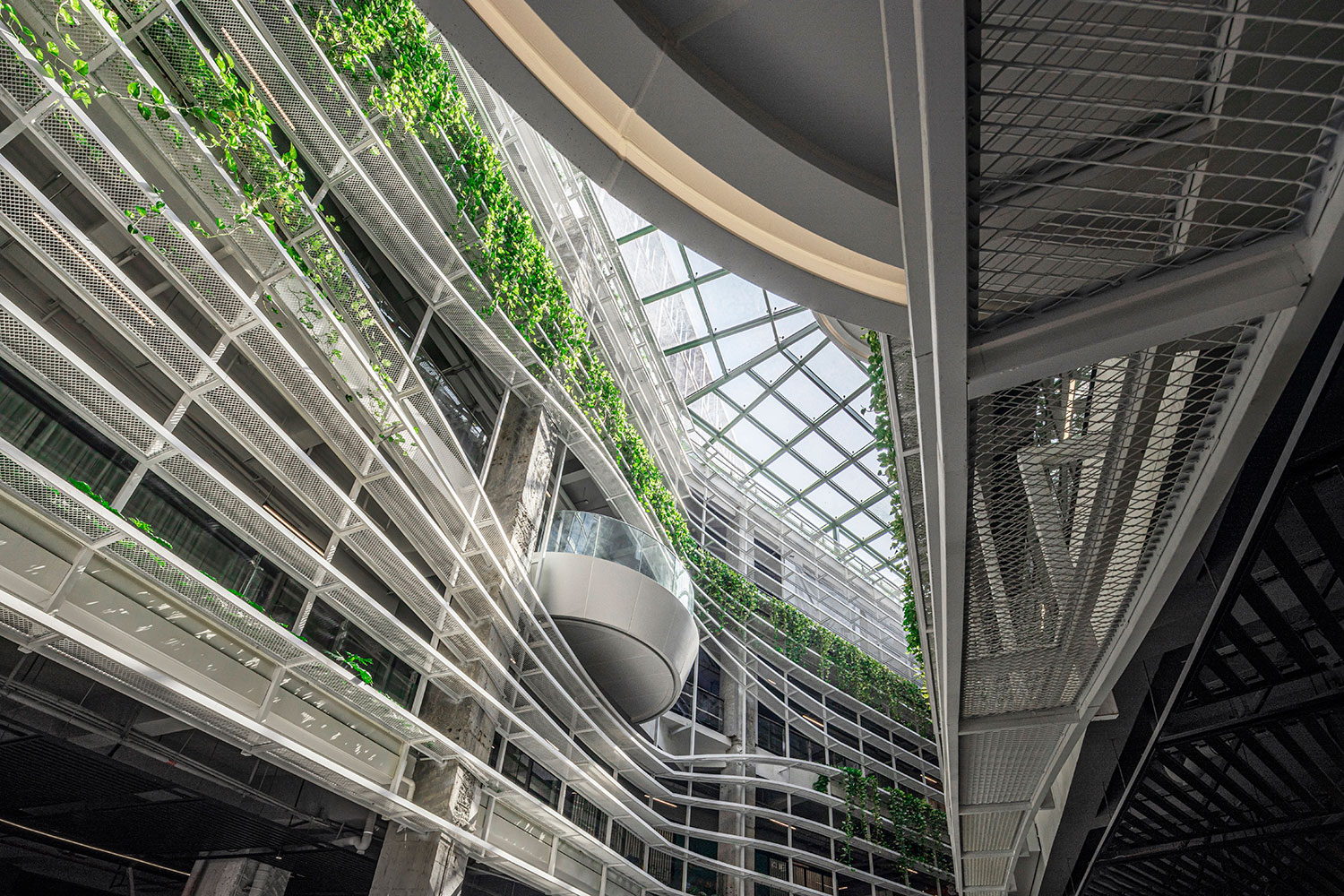 整個建築的裙樓樓層,透過中央生態綠軸線的挑空置入,各式商業與辦公活動交織成一種生活場景的共用社區表情,如同人們在山谷裡匯聚一般,同時也為社區注入了最重要的永續生態環境。